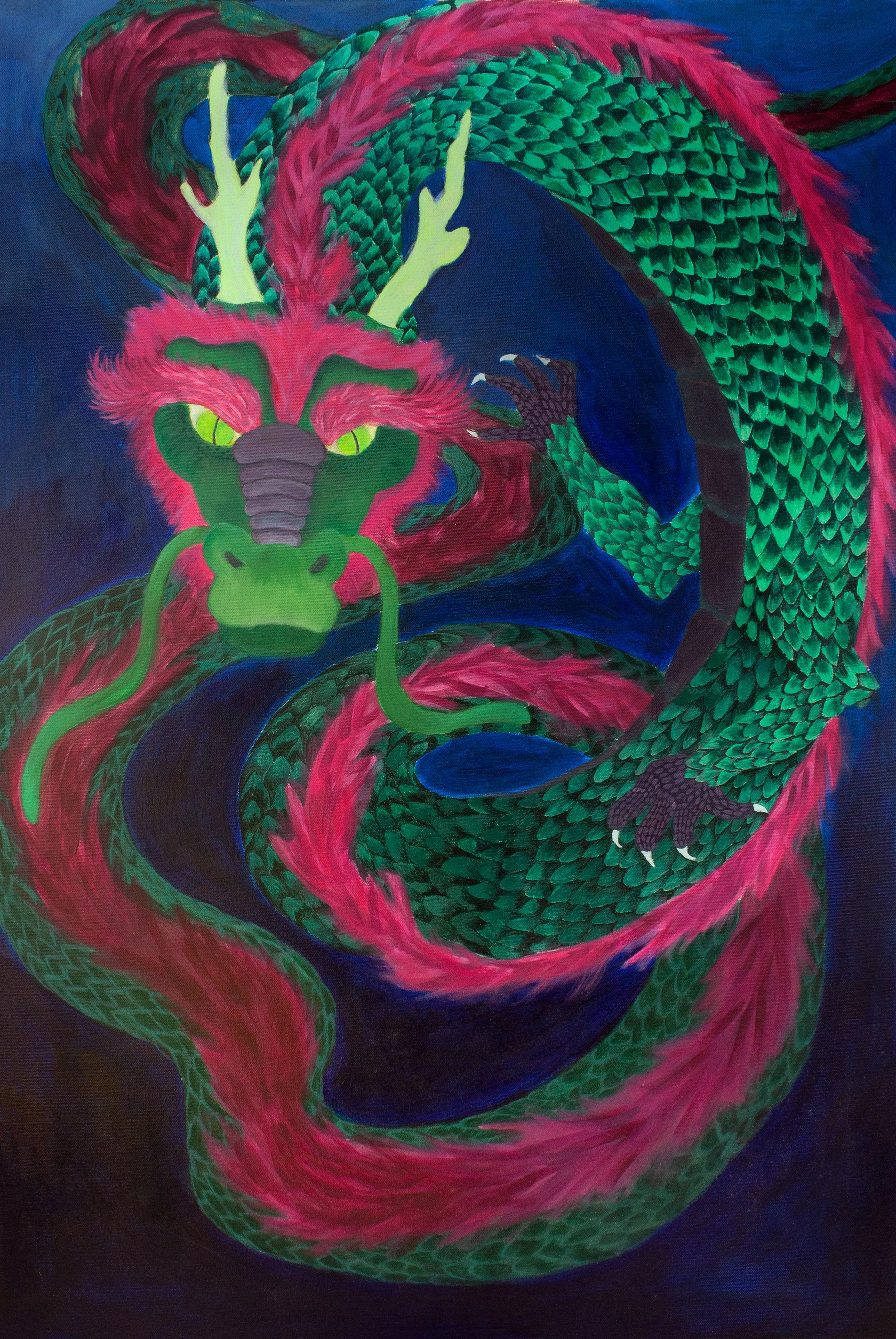 This piece was for my Painting II class an exercise in painting something that does not exist. The challenge was in giving dimension and structure to a fictional creature. I chose to paint a dragon because I’m fascinated with Asian culture. I wanted to use a complementary color palette to be pleasing to the eye and chose a combination of more vibrant and dark tones so the dragon looks as if it is coming toward the viewer.